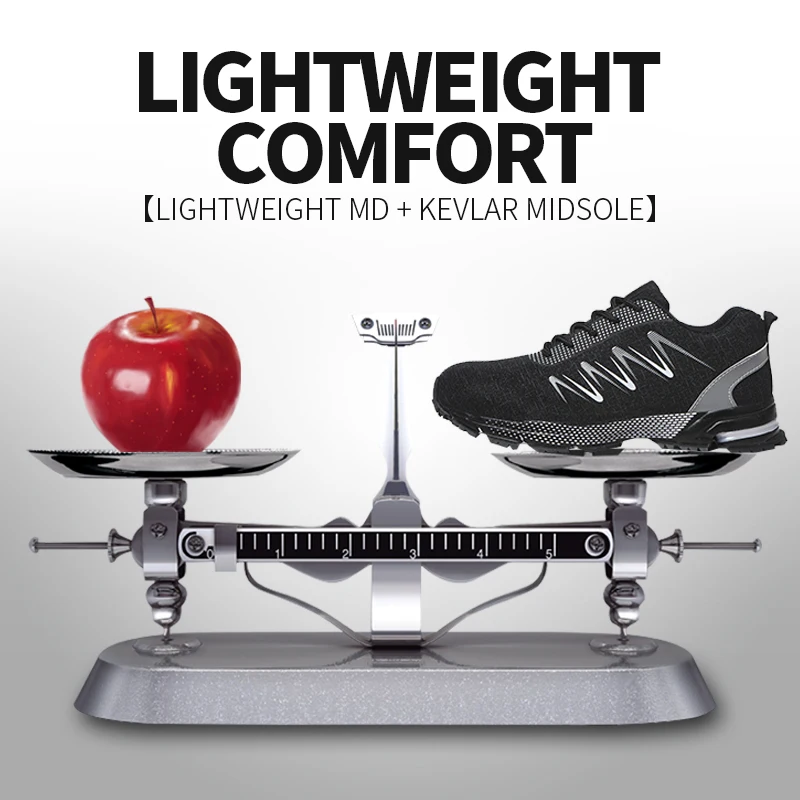 Ultralight safety shoe:It is like the weight of a pair of running shoes. They can help you to work happily all day without exhausting your feet. With super soft insoles and High elastic sole, your feet are safe and comfortable. Flying knit upper is very soft, Keep your feet comfortable and breathable.